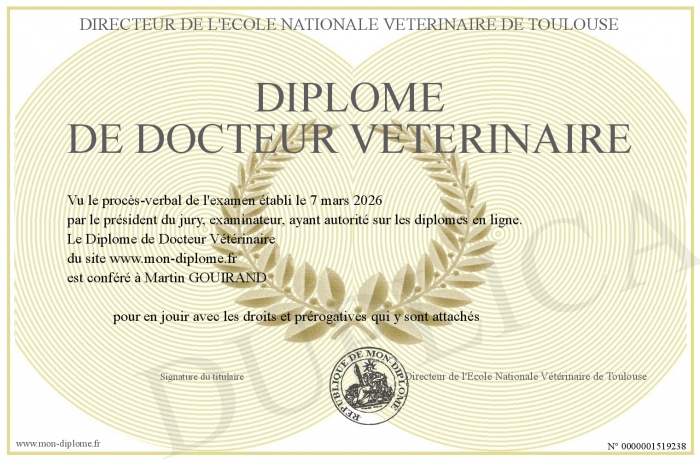 Envoyez par email votre Diplôme de Docteur Vétérinaire personalisé