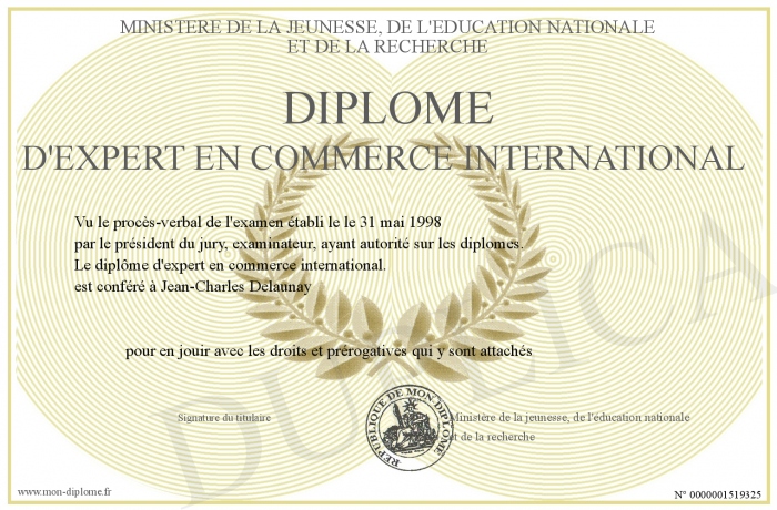 Envoyez par email votre Diplome d'expert en commerce international personalisé