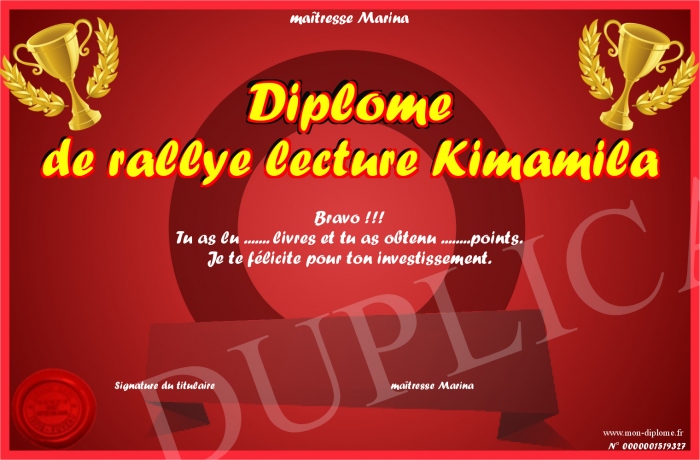 Envoyez par email votre Diplôme de rallye lecture Kimamila personalisé