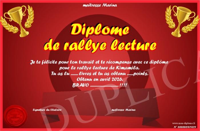 Envoyez par email votre Diplôme de rallye lecture personalisé