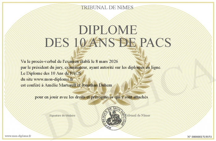Envoyez par email votre Diplôme des 10 Ans de PACS personalisé