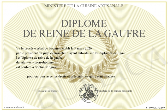 Envoyez par email votre Diplôme de reine de la gaufre personalisé