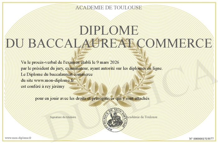 Envoyez par email votre Diplôme du baccalaureat commerce personalisé