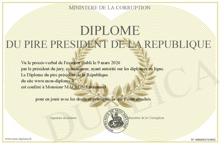 Envoyez par email votre Diplôme du pire président de la République personalisé