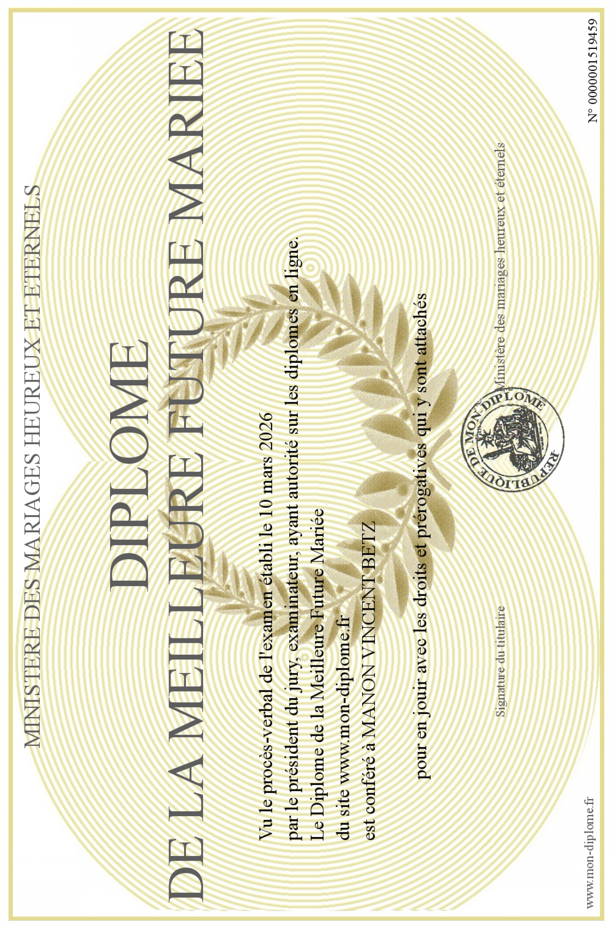 Envoyez par email votre Diplôme de la Meilleure Future Mariée personalisé