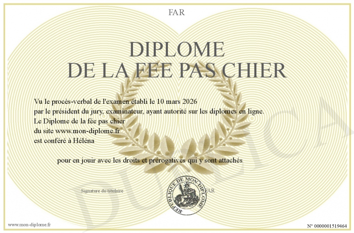 Envoyez par email votre Diplôme de la fée pas chier personalisé