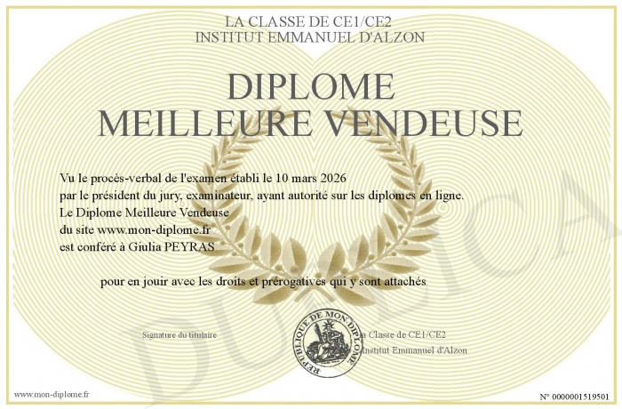 Envoyez par email votre Diplôme Meilleure Vendeuse personalisé