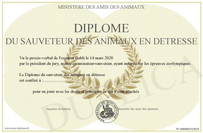 Envoyez par email votre Diplôme du sauveteur des animaux en détresse personalisé