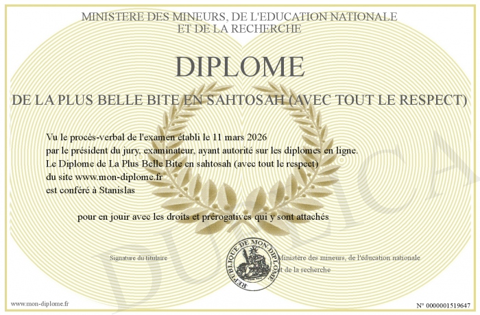 Envoyez par email votre Diplôme de La Plus Belle Bite en sahtosah (avec tout le respect) personalisé