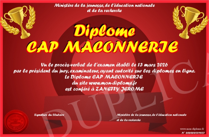 Envoyez par email votre Diplôme CAP MACONNERIE personalisé