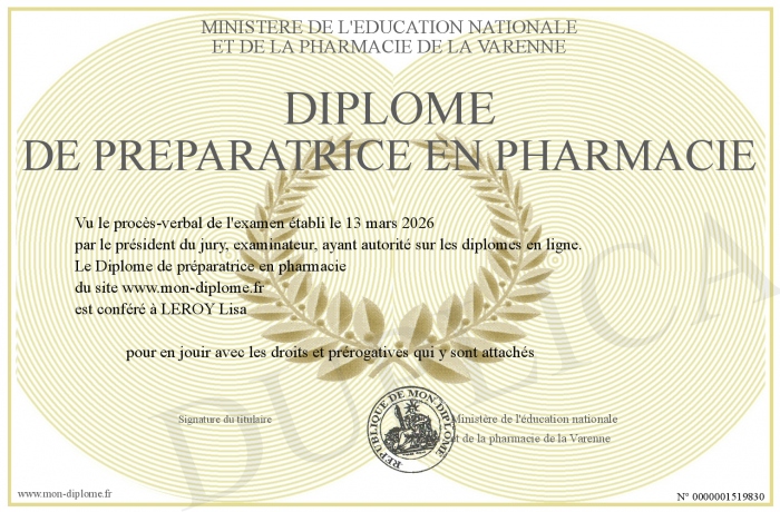 Envoyez par email votre Diplôme de préparatrice en pharmacie personalisé