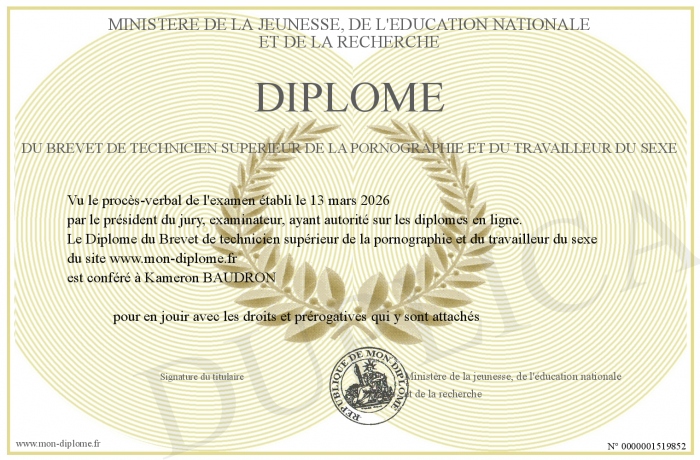 Envoyez par email votre Diplôme du Brevet de technicien supérieur de la pornographie et du travailleur du sexe personalisé