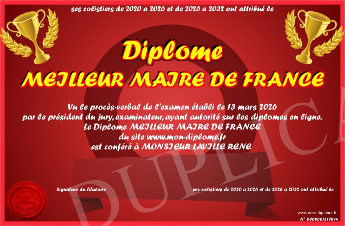 Envoyez par email votre Diplôme MEILLEUR MAIRE DE FRANCE personalisé
