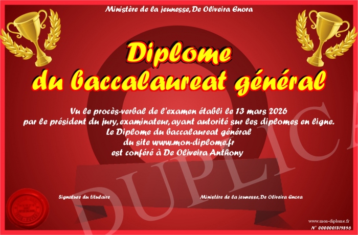 Envoyez par email votre Diplôme du baccalaureat général personalisé