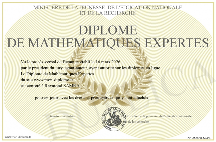 Envoyez par email votre Diplôme de Mathématiques Expertes personalisé