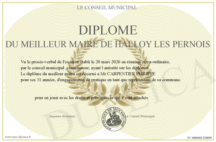 Envoyez par email votre Diplôme du meilleur Maire de Halloy Les Pernois personalisé