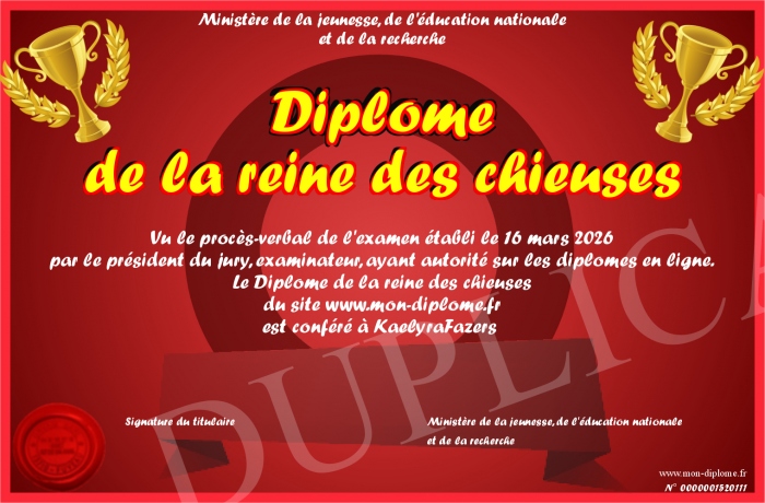 Envoyez par email votre Diplôme de la reine des chieuses personalisé