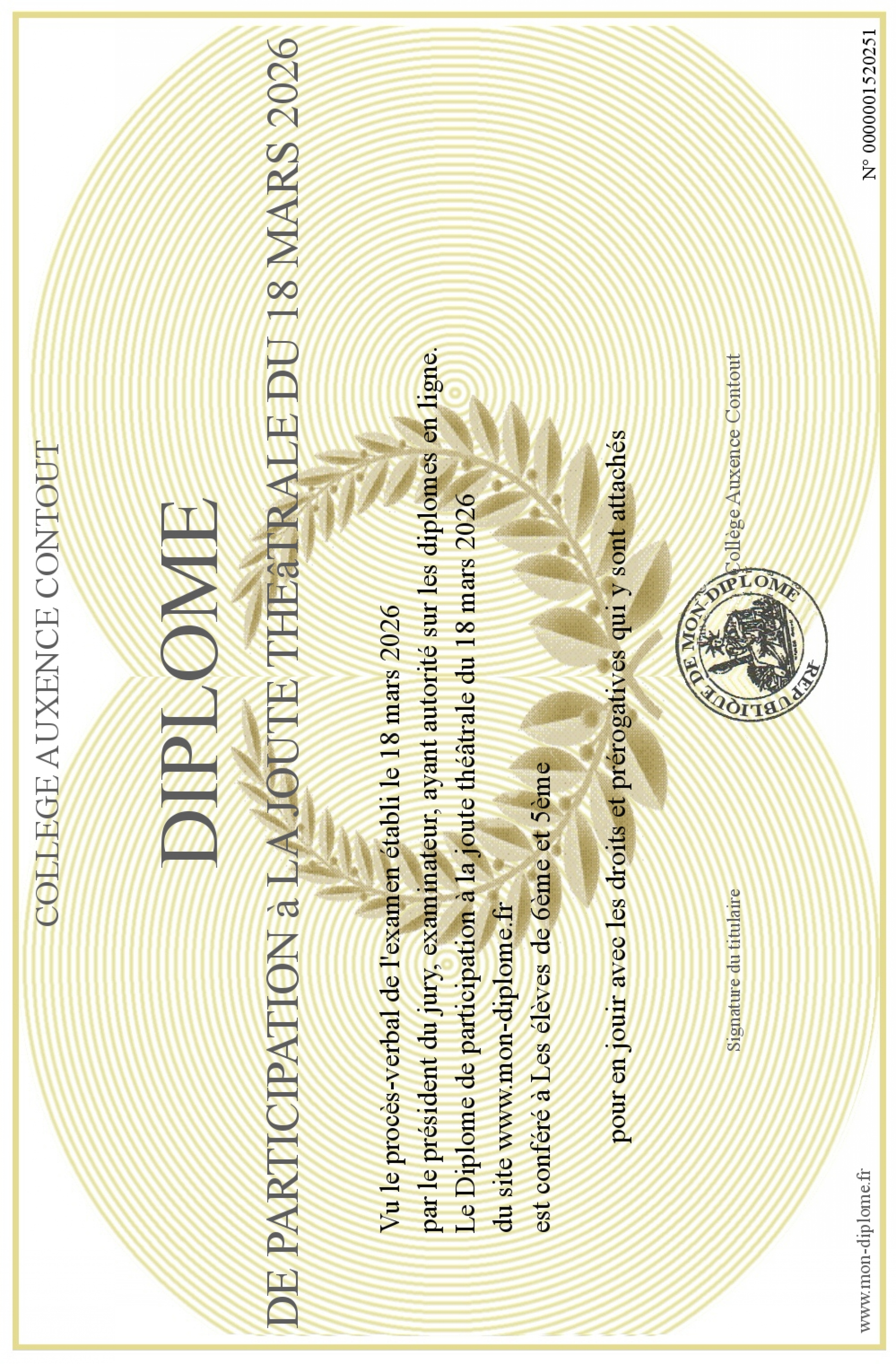 Envoyez par email votre Diplôme de participation à la joute théâtrale du 18 mars 2026 personalisé