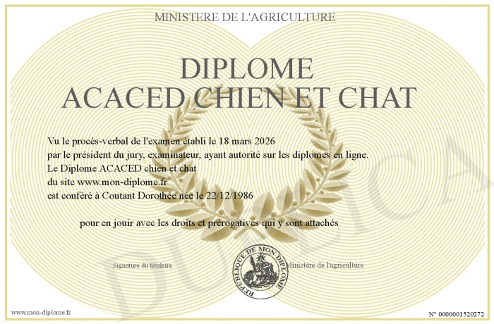Envoyez par email votre Diplôme ACACED chien et chat personalisé