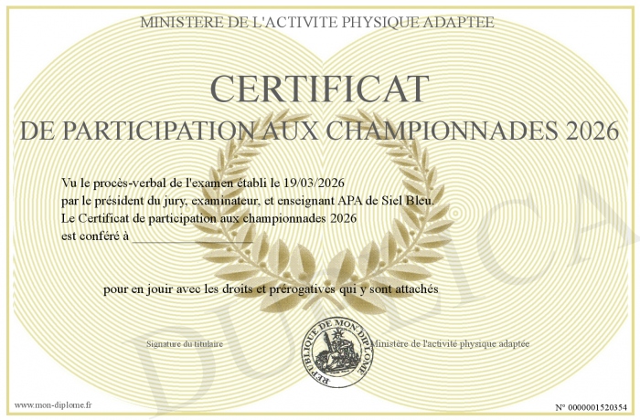 Envoyez par email votre Certificat de participation aux championnades 2026 personalisé