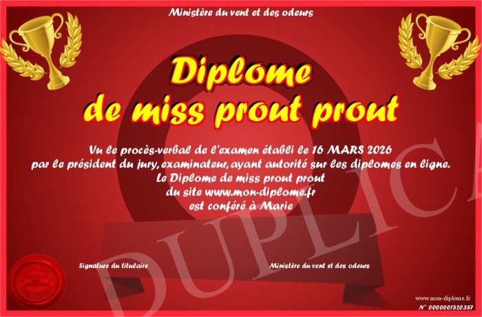 Envoyez par email votre Diplôme de miss prout prout personalisé
