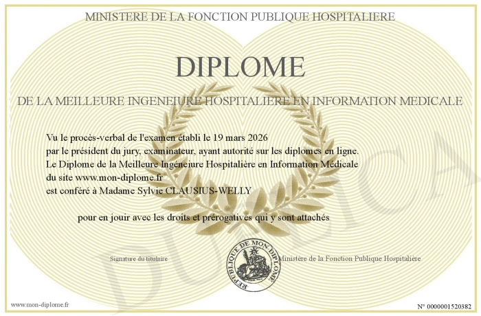 Envoyez par email votre Diplôme de la Meilleure Ingéneiure Hospitalière en Information Médicale personalisé