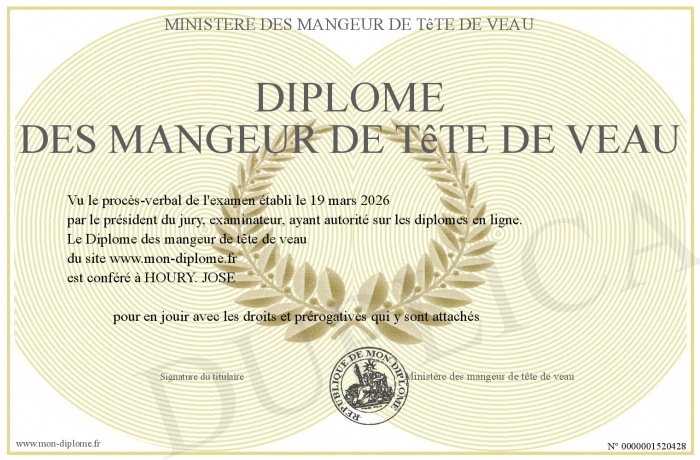 Envoyez par email votre Diplôme des mangeur de tête de veau personalisé