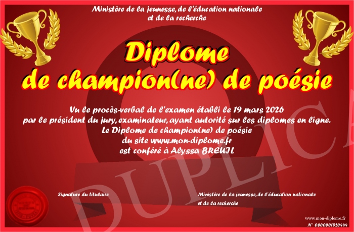 Envoyez par email votre Diplôme de champion(ne) de poésie personalisé
