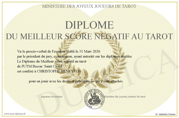 Envoyez par email votre Diplôme du Meilleur score négatif au tarot personalisé