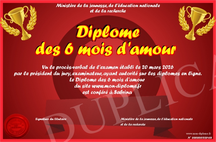 Envoyez par email votre Diplôme des 6 mois d'amour personalisé
