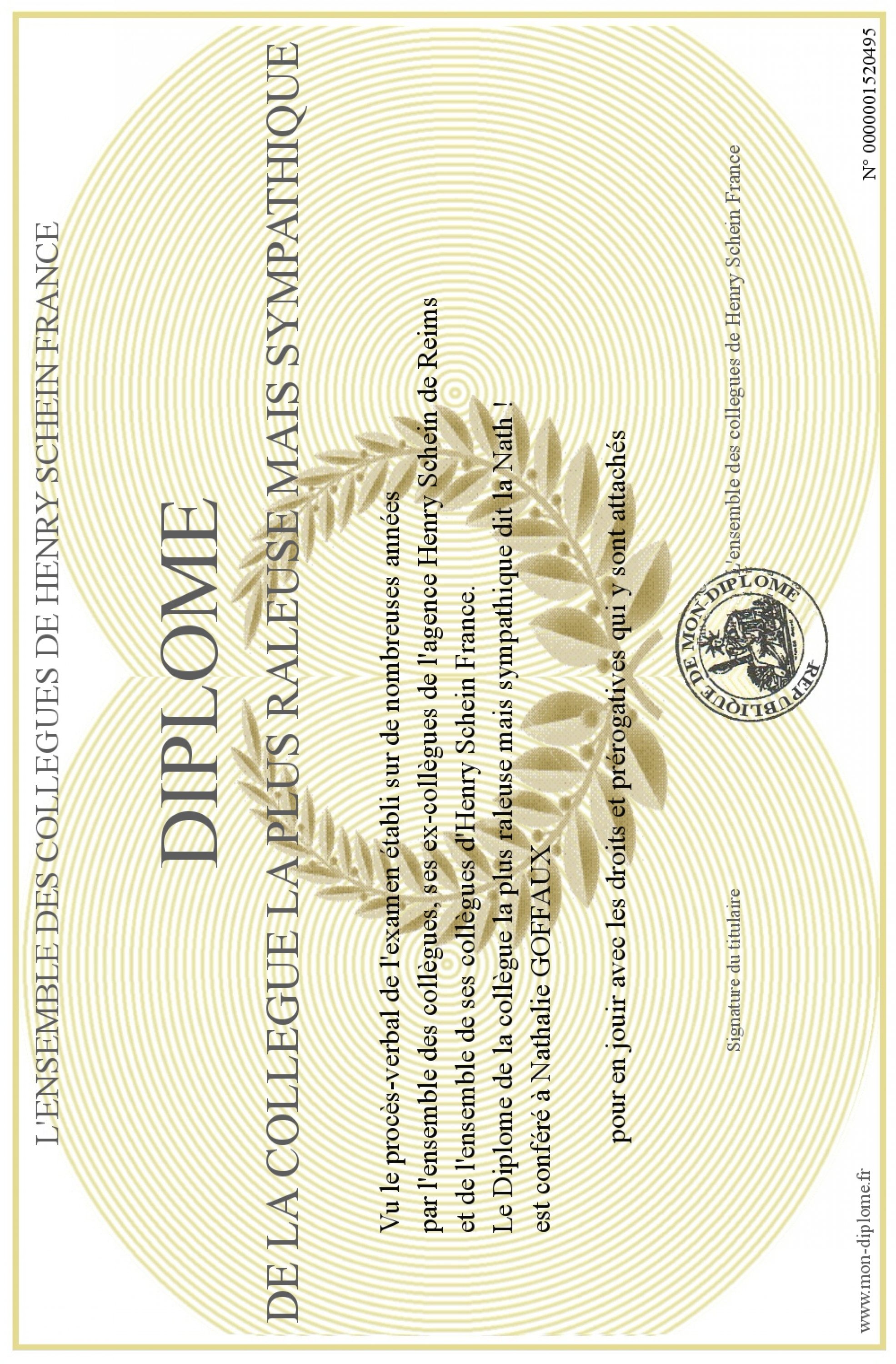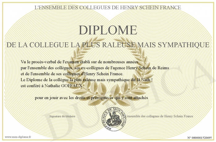 Envoyez par email votre Diplôme de la collègue la plus raleuse mais sympathique personalisé