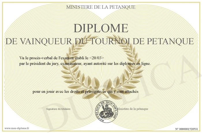 Envoyez par email votre Diplôme de vainqueur du tournoi de pétanque personalisé