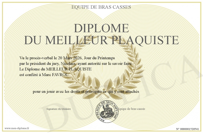 Envoyez par email votre Diplôme du MEILLEUR PLAQUISTE personalisé