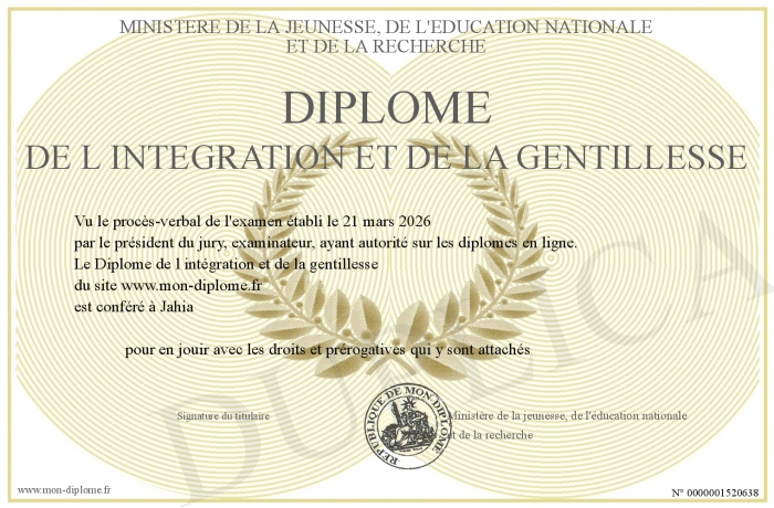 Envoyez par email votre Diplôme de l intégration et de la gentillesse personalisé