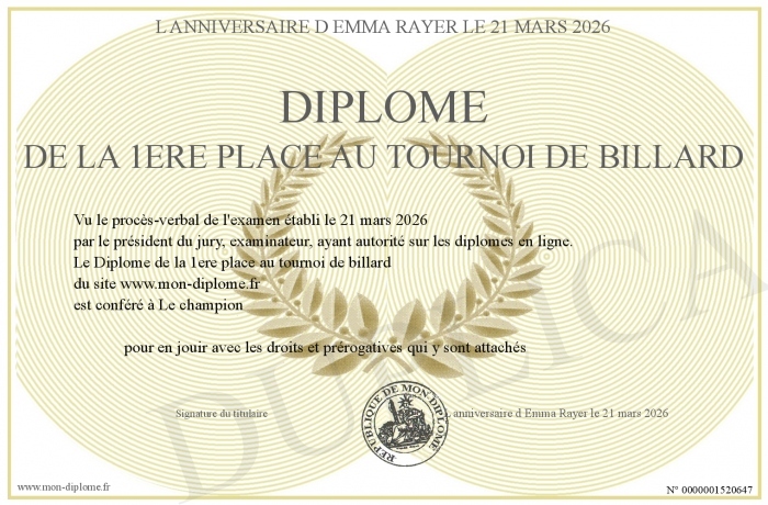 Envoyez par email votre Diplôme de la 1ere place au tournoi de billard personalisé