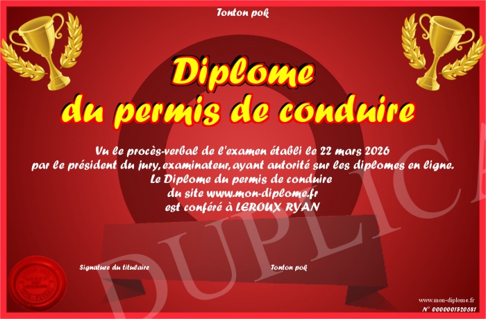 Envoyez par email votre Diplôme du permis de conduire personalisé
