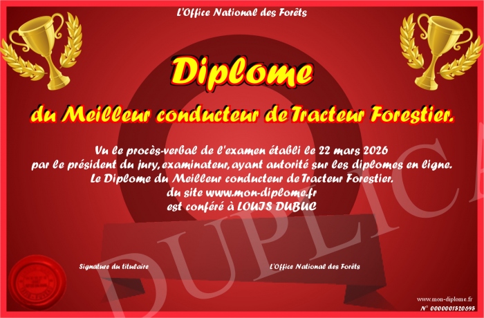 Envoyez par email votre Diplôme du Meilleur conducteur de Tracteur Forestier. personalisé