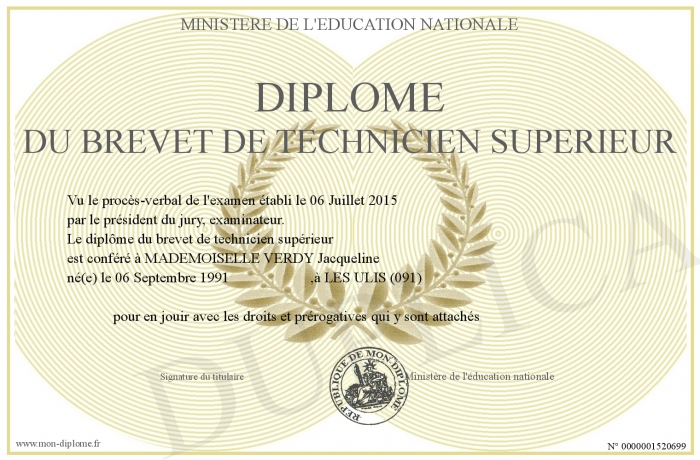Envoyez par email votre Diplôme du brevet de technicien supérieur personalisé