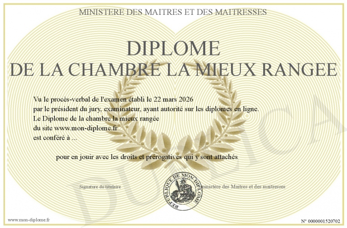 Envoyez par email votre Diplôme de la chambre la mieux rangée personalisé