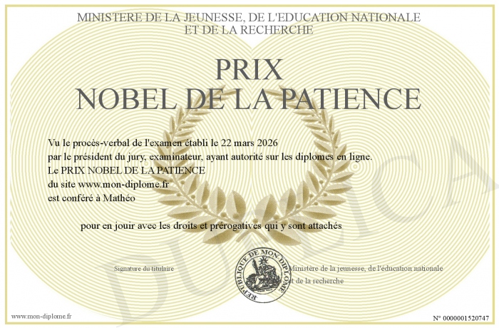 Envoyez par email votre PRIX NOBEL DE LA PATIENCE personalisé