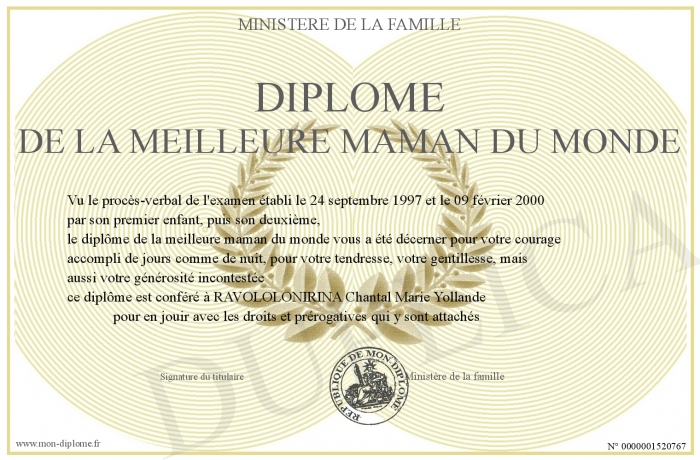 Envoyez par email votre Diplôme de la meilleure maman du monde personalisé