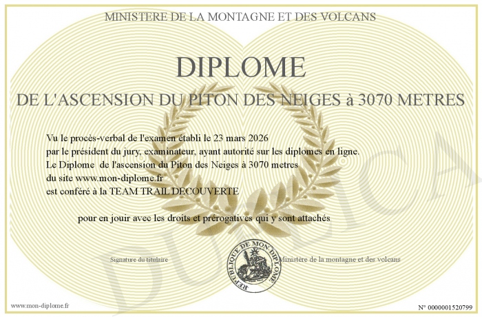 Envoyez par email votre Diplôme de l'ascension du Piton des Neiges à 3070 metres personalisé