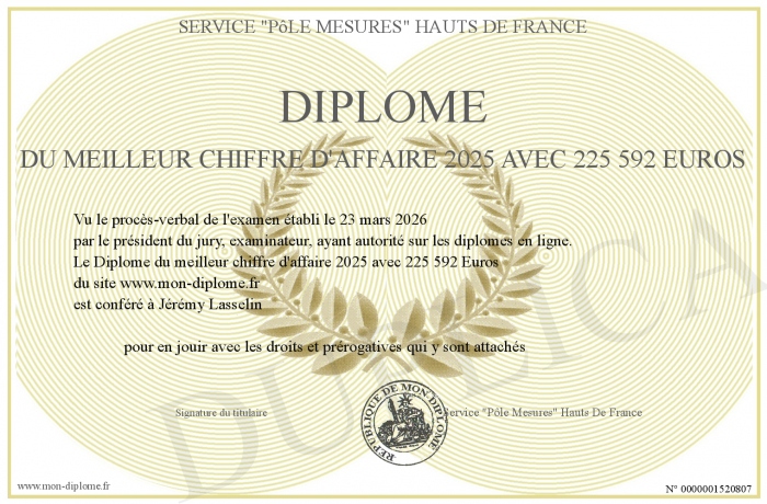 Envoyez par email votre Diplôme du meilleur chiffre d'affaire 2025 avec 225 592 Euros personalisé
