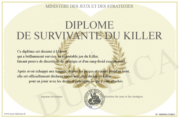 Envoyez par email votre Diplôme de survivante du killer personalisé