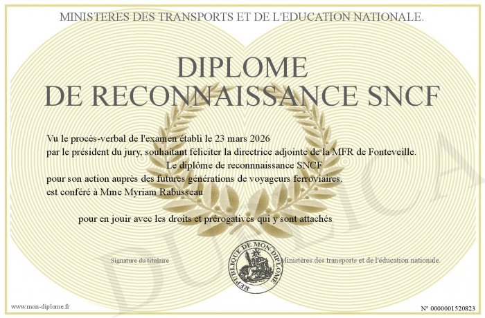 Envoyez par email votre Diplôme de reconnaissance SNCF personalisé