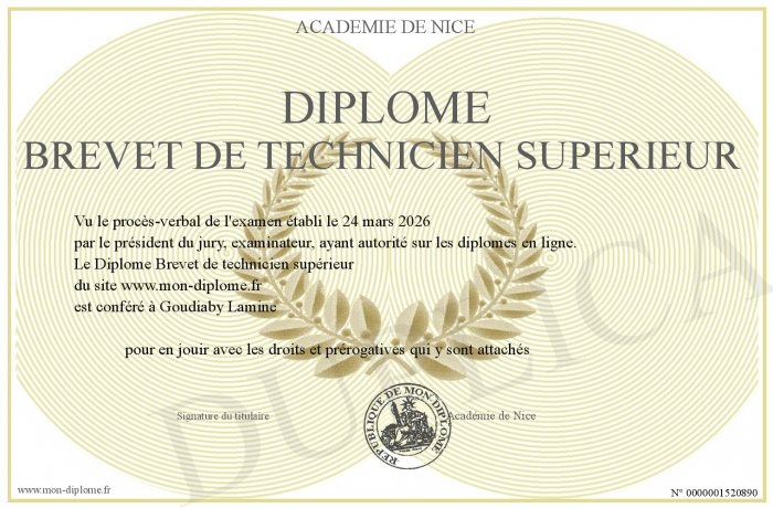 Envoyez par email votre Diplôme Brevet de technicien supérieur personalisé