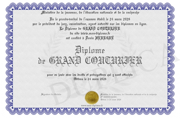 Envoyez par email votre Diplôme de GRAND COUTURIER personalisé