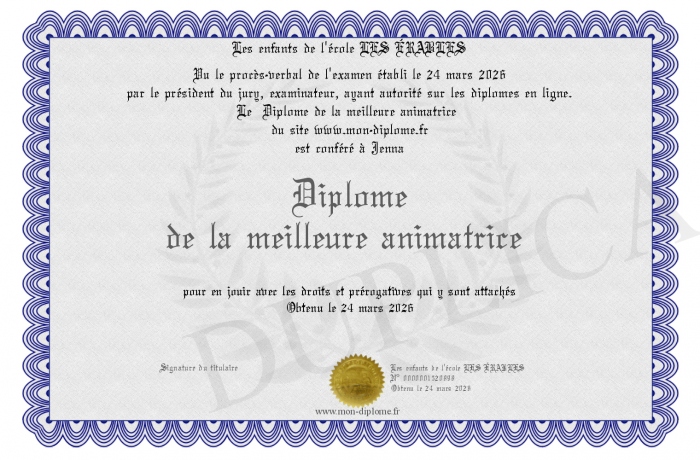 Envoyez par email votre Diplome de la meilleure animatrice personalisé