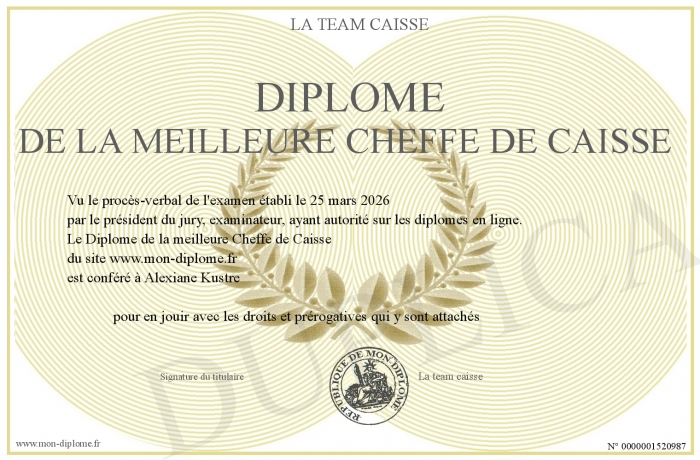 Envoyez par email votre Diplôme de la meilleure Cheffe de Caisse personalisé