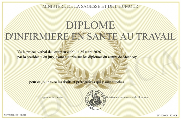 Envoyez par email votre Diplôme d'infirmière en santé au travail personalisé